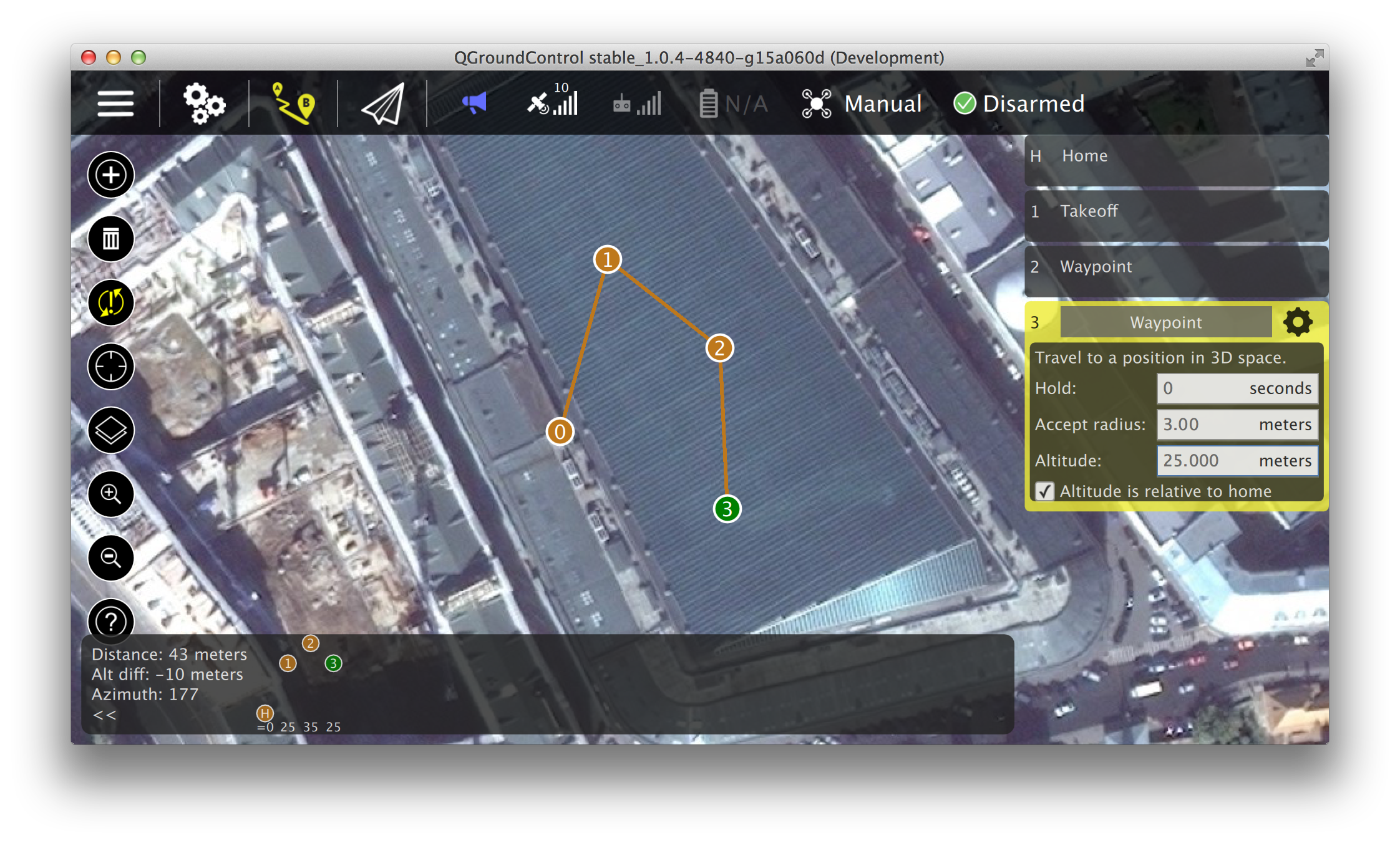 To plan a new mission, switch to the planning tab, click on the + icon in the top left and click on the map to create waypoints. A context menu will open on the side to adjust the waypoints. Click on the highlight transmission icon to send them to the vehicle.